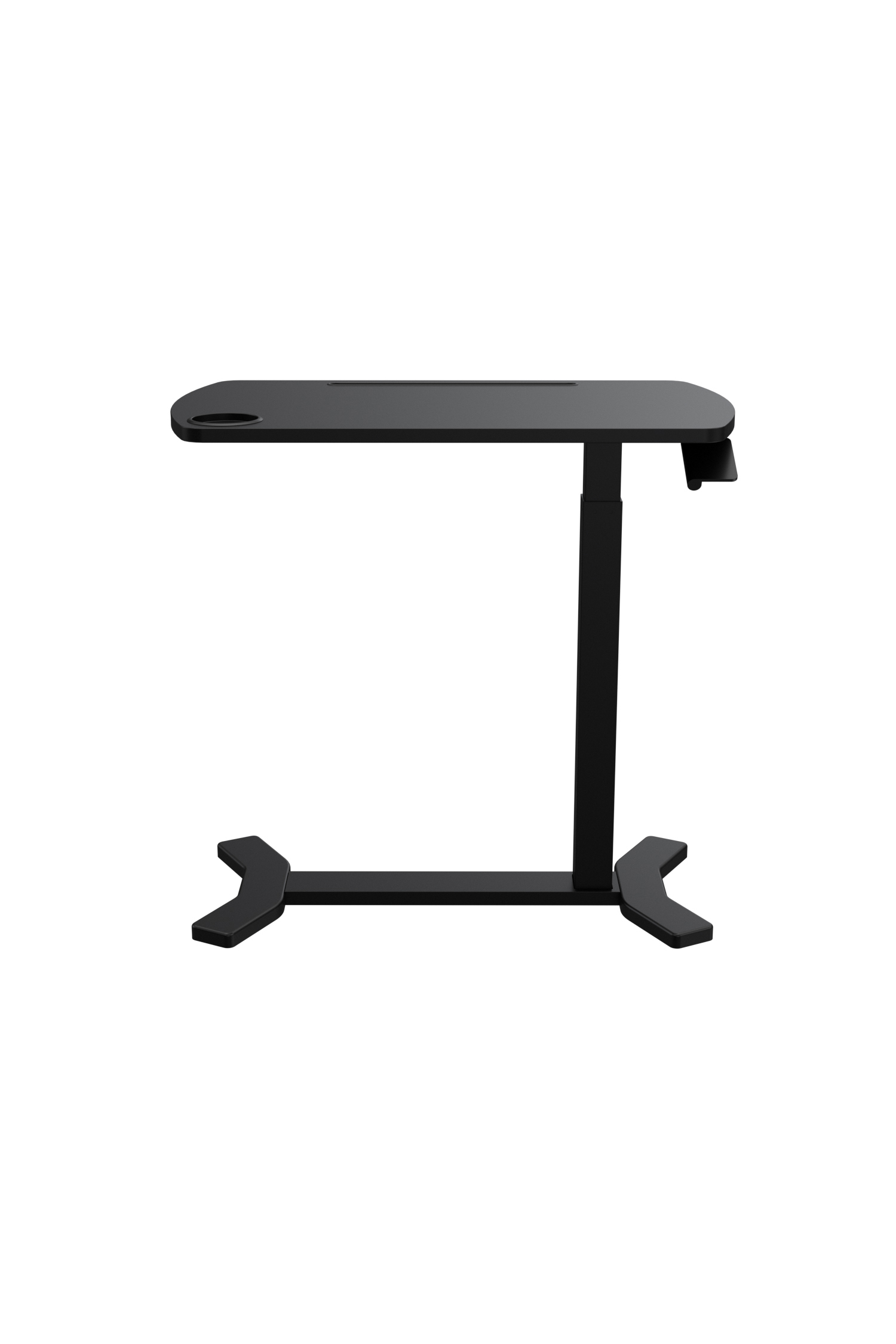 La mesa Laptop cuenta con una superficie en MDF de 70 × 40 cm que incorpora portavasos, brindando un espacio funcional y organizado. Su estructura metálica de un solo apoyo integra ruedas que facilitan el desplazamiento y un sistema de regulación en altura, permitiendo ajustar su uso según la necesidad.