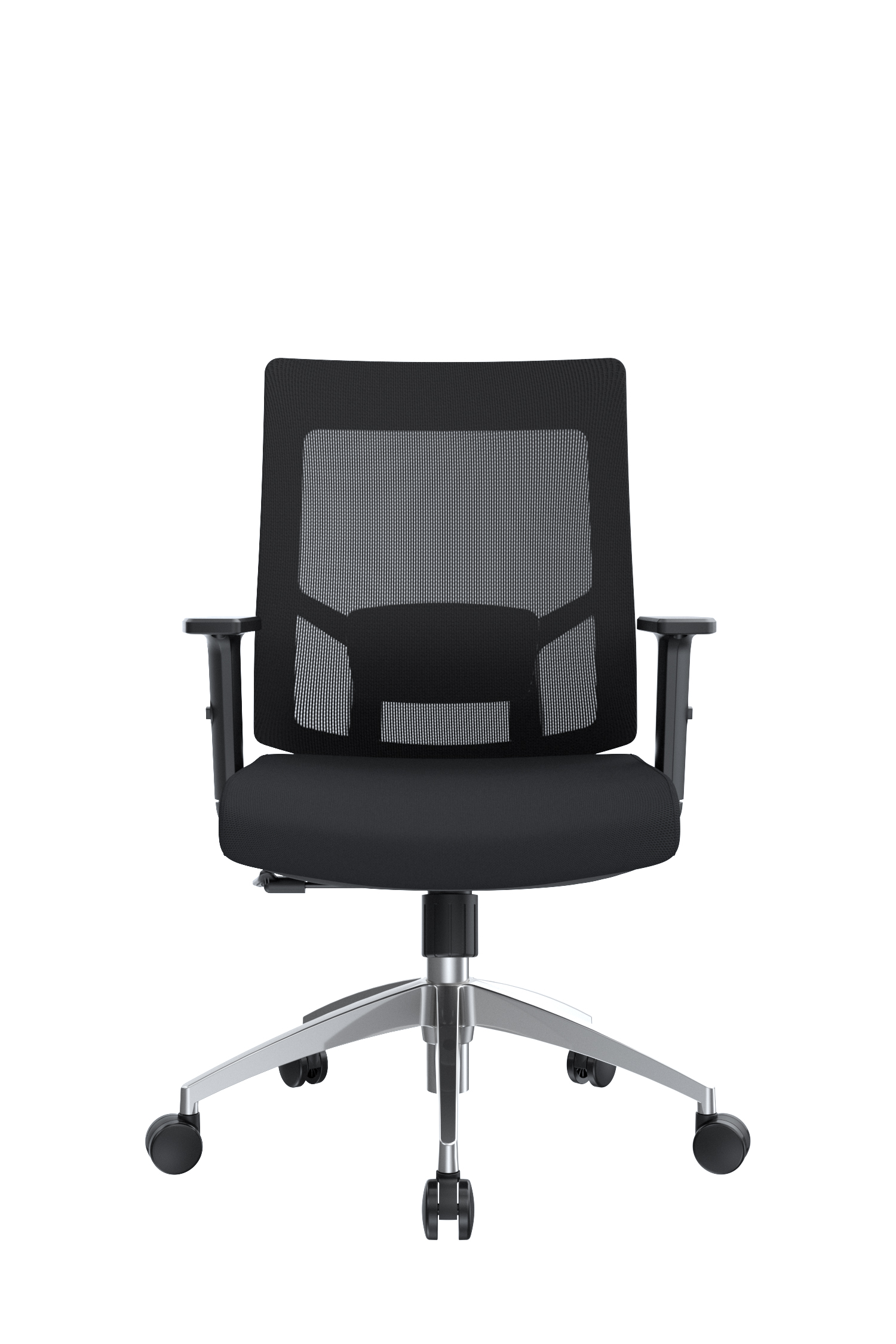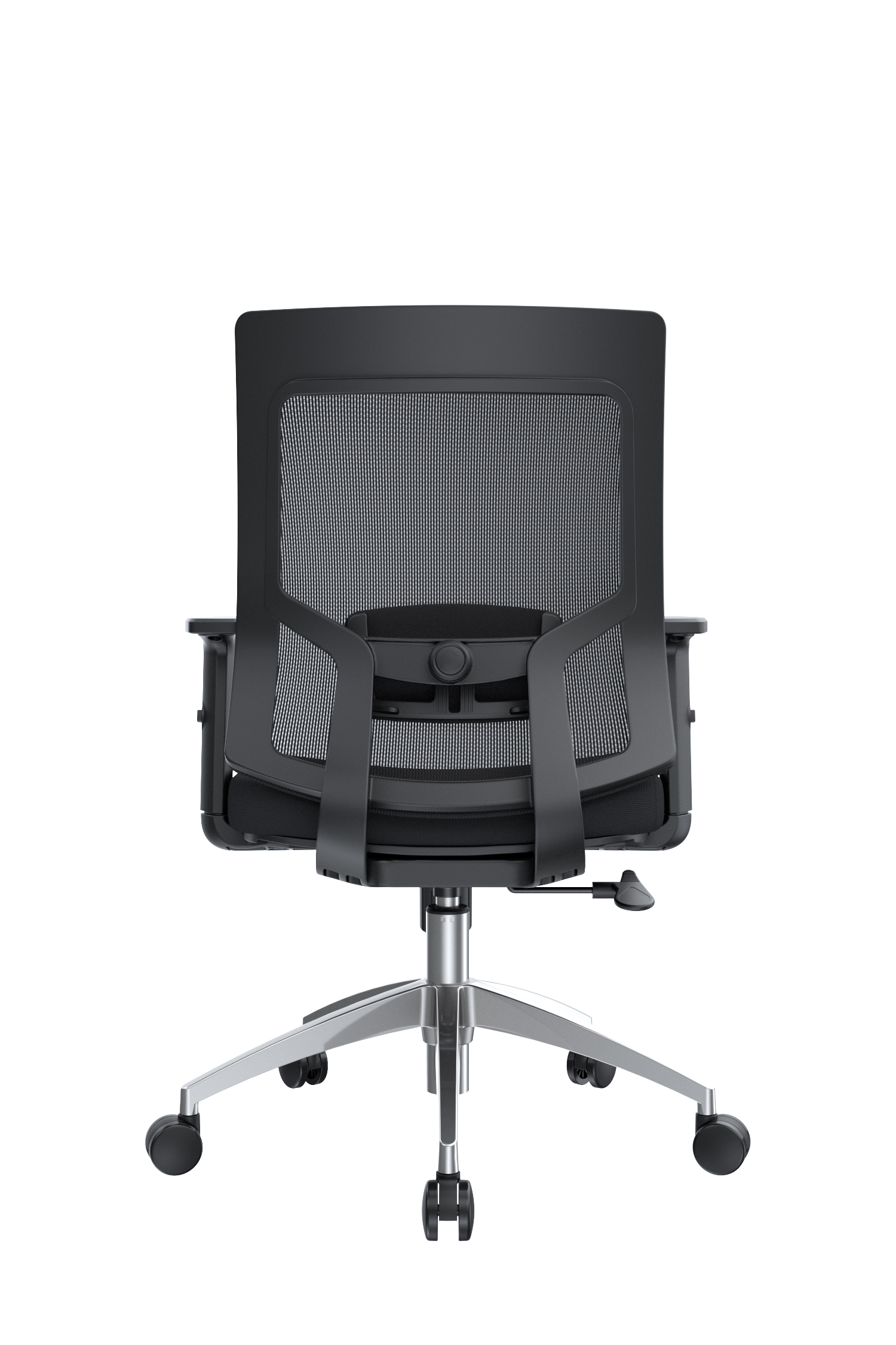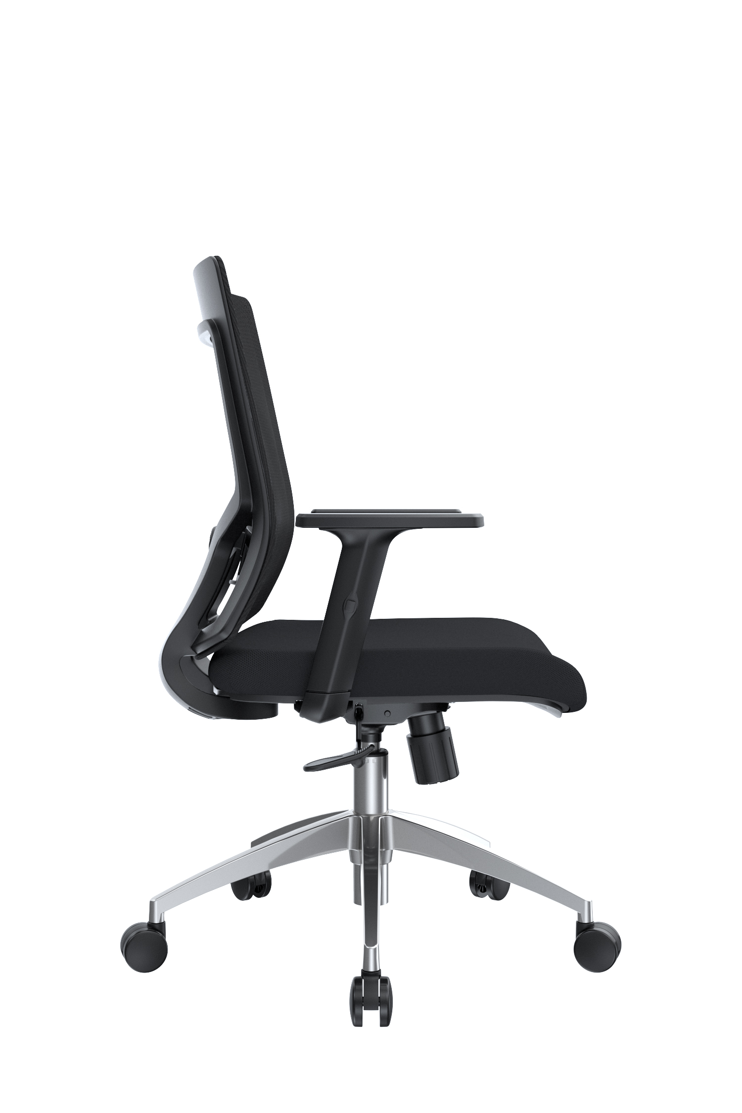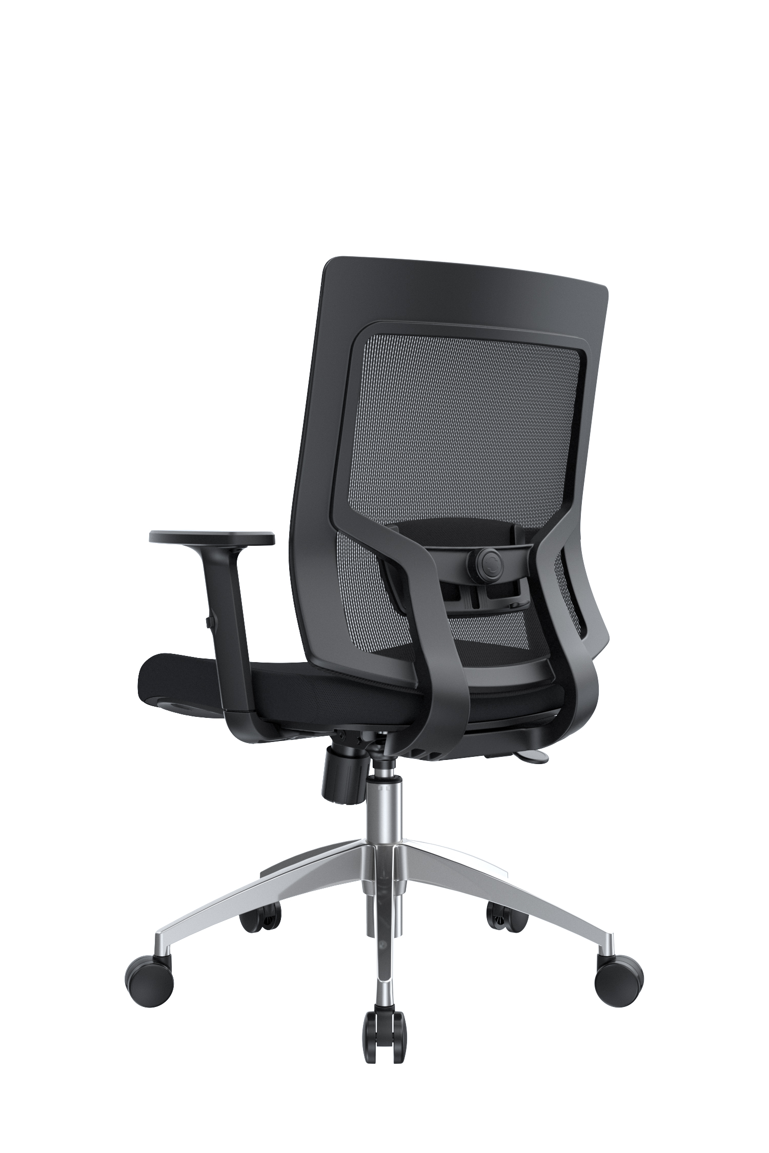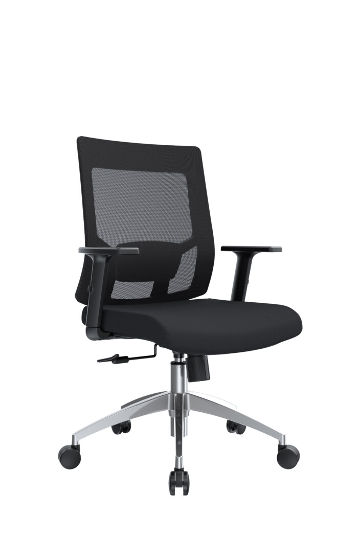La silla Radius cuenta con un espaldar de polipropileno con malla tipo poliéster, acompañado de un apoyo lumbar tapizado en espuma laminada y textil negro, regulable tanto en altura como en profundidad mediante perilla. Su asiento incluye una base interna en madera contrachapada, cubierta externa en polipropileno negro, espuma laminada y tapizado en textil. Los brazos son regulables en altura, con pad superior en polipropileno. Incorpora un mecanismo basculante de un bloqueo con perilla de control de tensión, neumático a gas comprimido con recorrido de 85 mm, base de nylon de 600 mm y ruedas de nylon de 50 mm, garantizando estabilidad y movilidad.